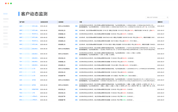 基于产品名、公司名称、HS编码等精准搜索目标客户或系统基于您的真实业务场景智能推荐客户,并生成客户开发日历,您只需有序跟进,极可能成为您的客户。