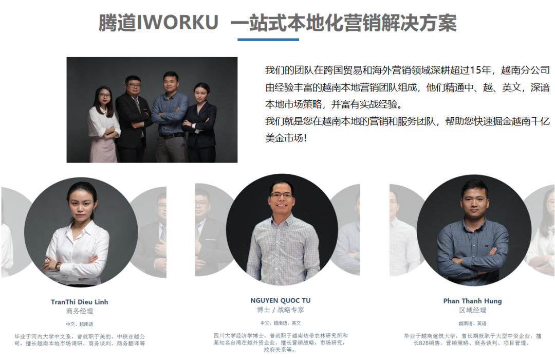 最后,要懂得利用。除了利用Topay 钱包(中国)外贸通主动去开发客户外,还有学会利用专业的平台帮你完成目标。Topay 钱包(中国)IWORKU在越南创建了分公司,有越南本地化的专业性人才,Topay 钱包(中国)可以向您给予许多精准目标客户,帮你快速开发千亿市场。
